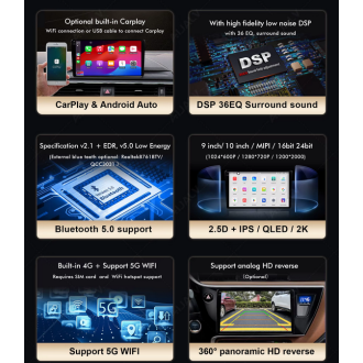 GPS, Stéréo, HANDSFREE, Amplificateur, Carplay, Image dans l'image, Built-in Microphone, Écran partagé, Gestionnaire de fichiers, Volant de voiture de Contrôle